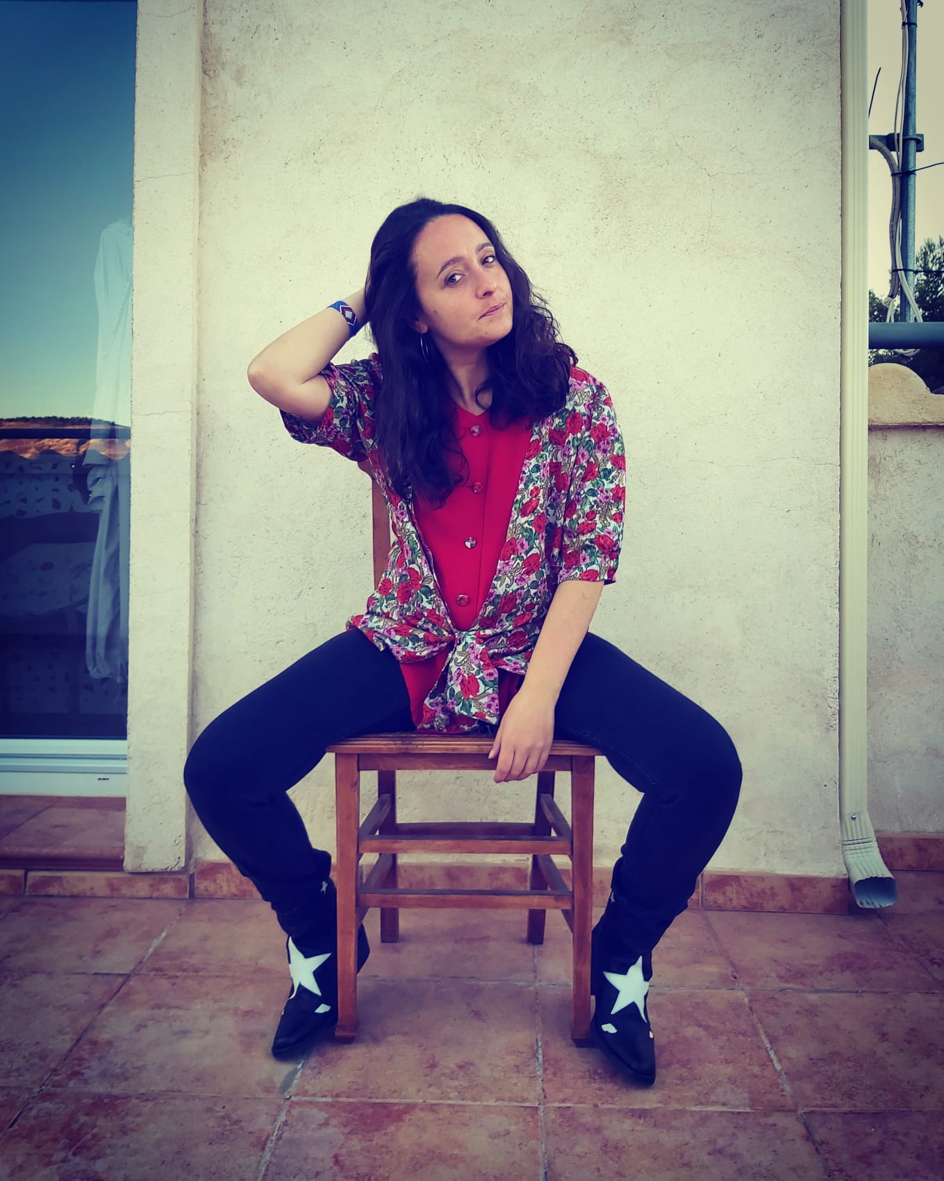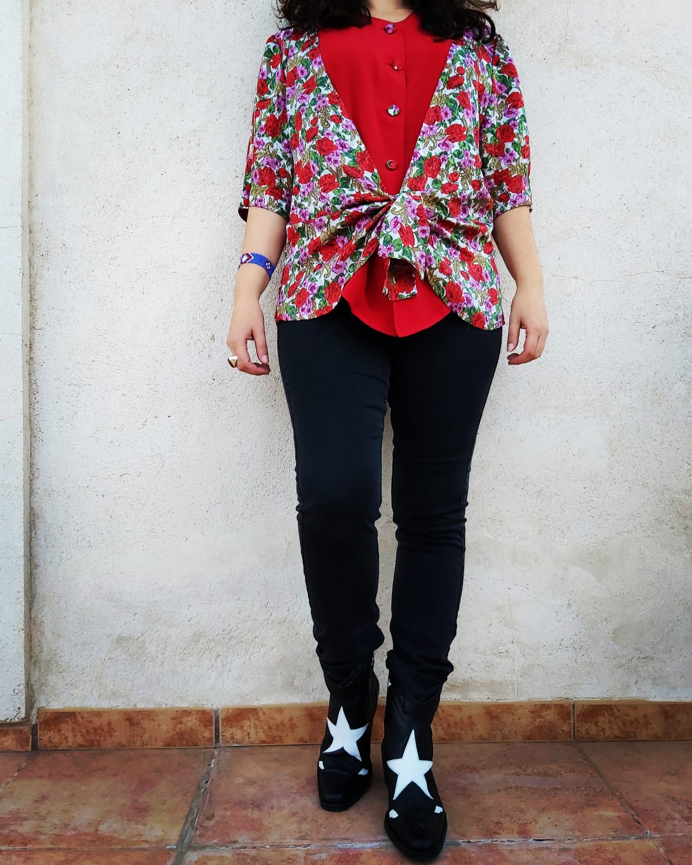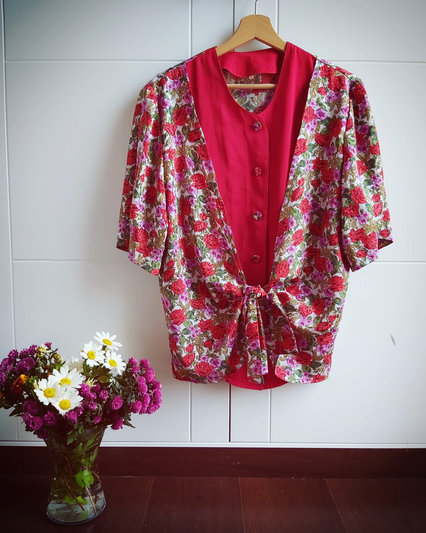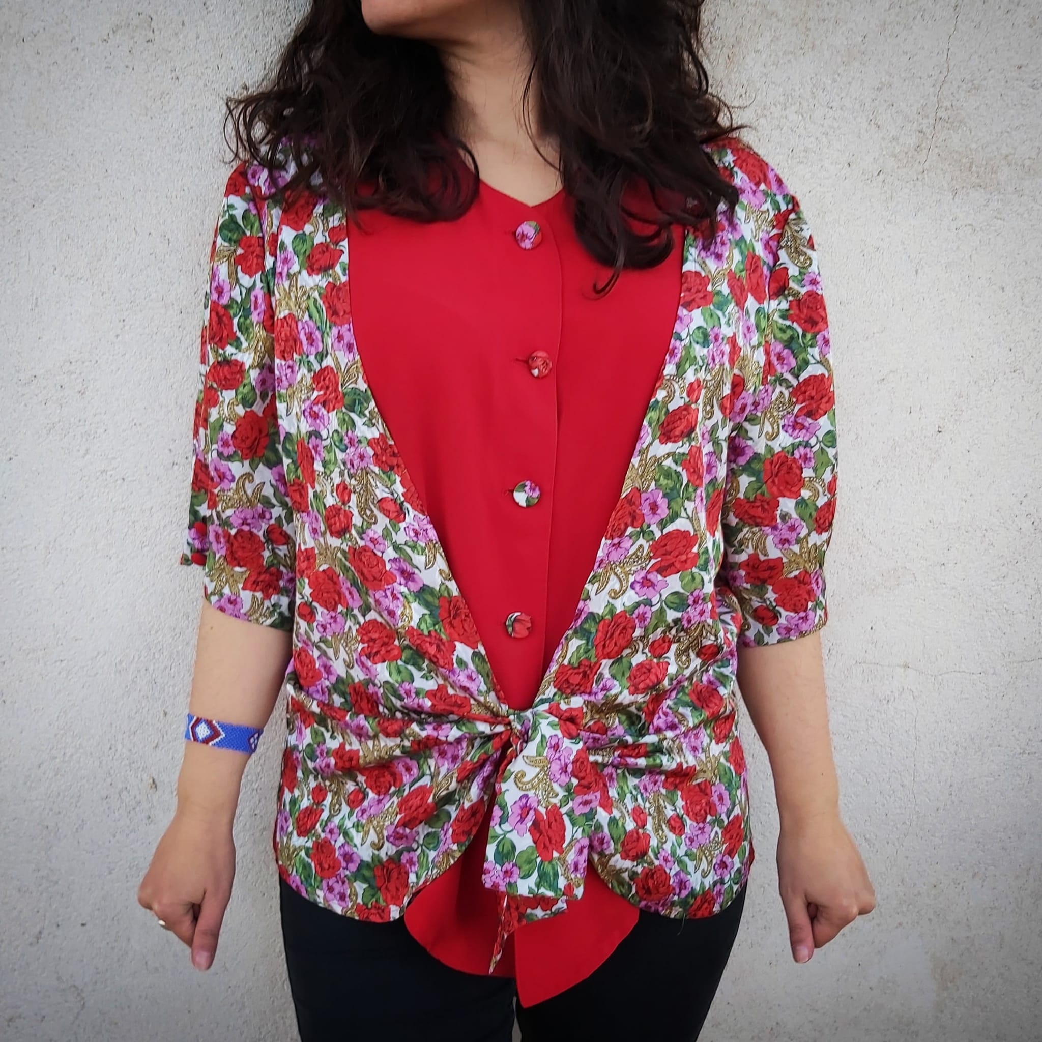 Camisa Vintage original con un estampado precioso de flores que termina en nudo delantero, botones forrados a juego y una baja camisa roja en acabado seda.